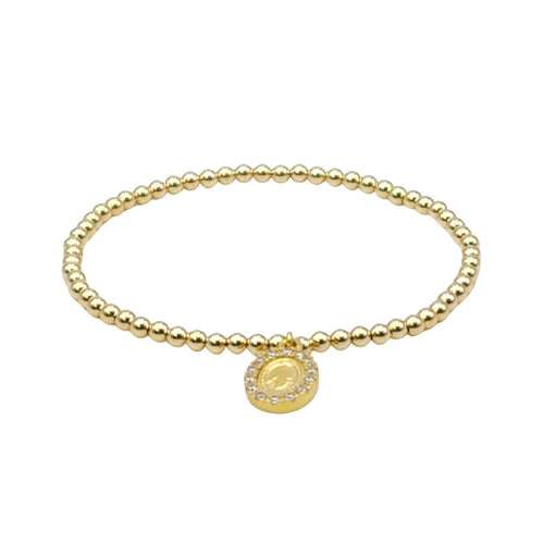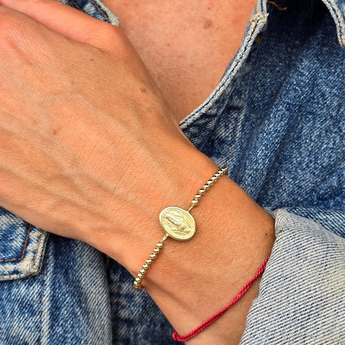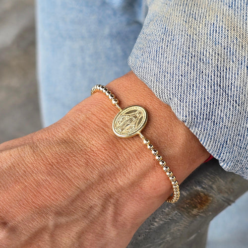 • Mother Mary Gold Filled Bracelet, Religious Coin Bracelet, Isabella Celini, Religious Jewelry, Gold Filled Beads, Stretch Stacking Bracelet