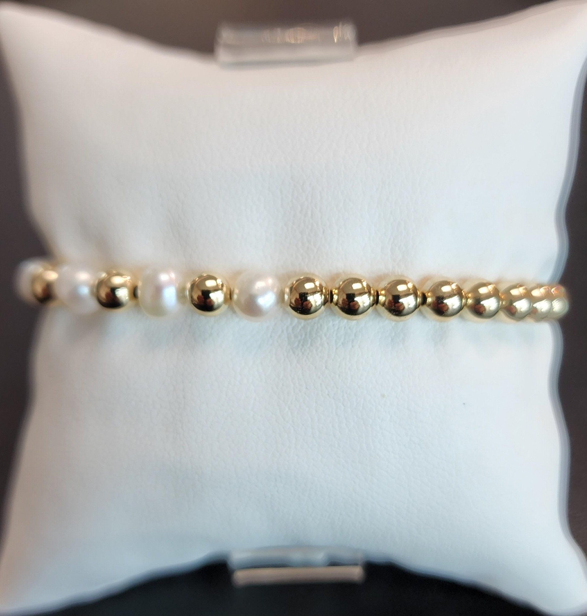 14KT Gold Filled Beaded Bracelet - Stretch Fresh Water Pearl Layering Design - Tarnish Free Jewelry