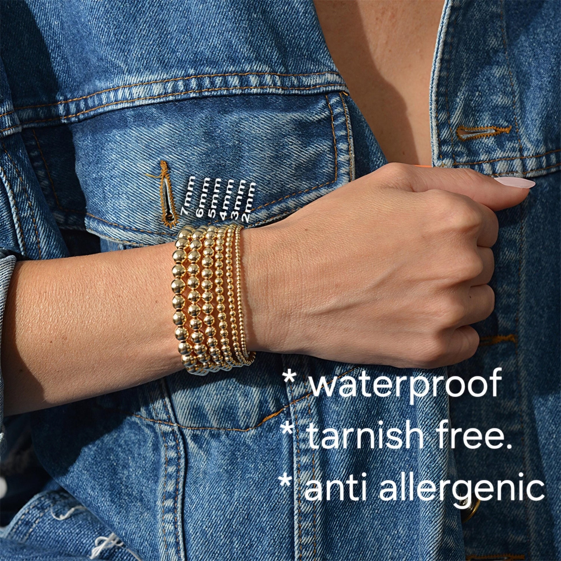 Each bracelet features delicate 3 mm Gold Filled (14/20) beads that shimmer with every movement, showcasing their quality craftsmanship. Adorning the bracelet is a small disc pendant embellished with sparkling clear CZs, plated in luxurious sterling silver with a gold finish. This eye-catching detail adds a touch of glamour, making it a versatile piece that transitions seamlessly from day to night.