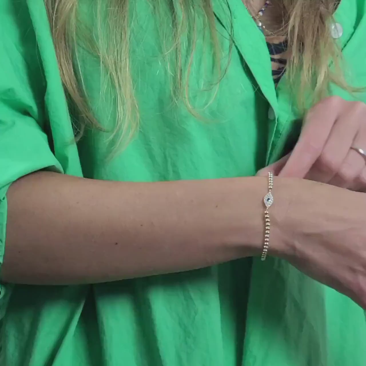 Discover the allure of our Gold Filled Beaded EVIL EYE BRACELET For Women, a delicate symbol of protection and style. Crafted with meticulous attention in our Miami workshop, this bracelet blends the timeless elegance of gold filled beads with the mystical charm of sterling silver Evil Eye accents. Each piece is made to order, ensuring a personal touch that reflects our commitment to quality craftsmanship.