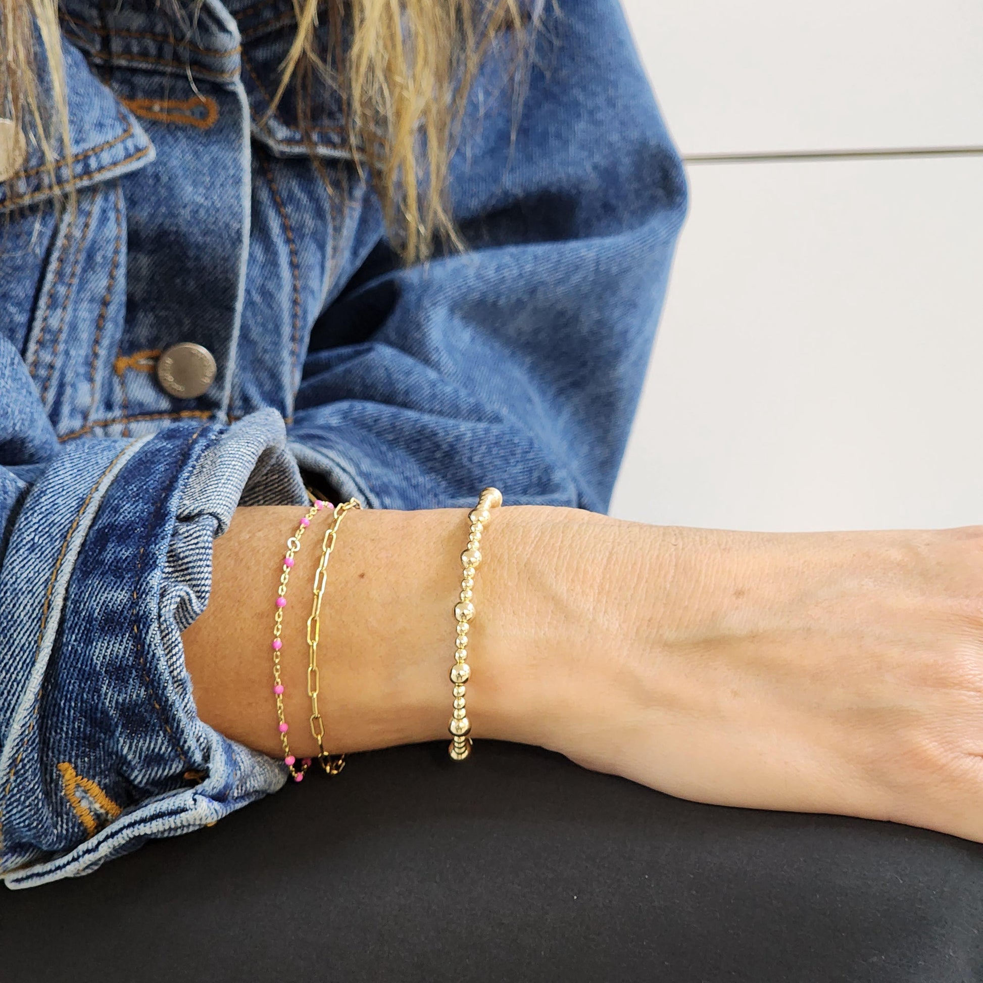 The bracelet features a combination of 3 mm and 5 mm round gold-filled beads, creating a delicate yet eye-catching design that is as comfortable as it is stylish. It is also available in sterling silver for those who prefer a different aesthetic. Adjustable to fit various wrist sizes, including options for adults and kids, you can select your preferred size from our dropdown menu to ensure the perfect fit.