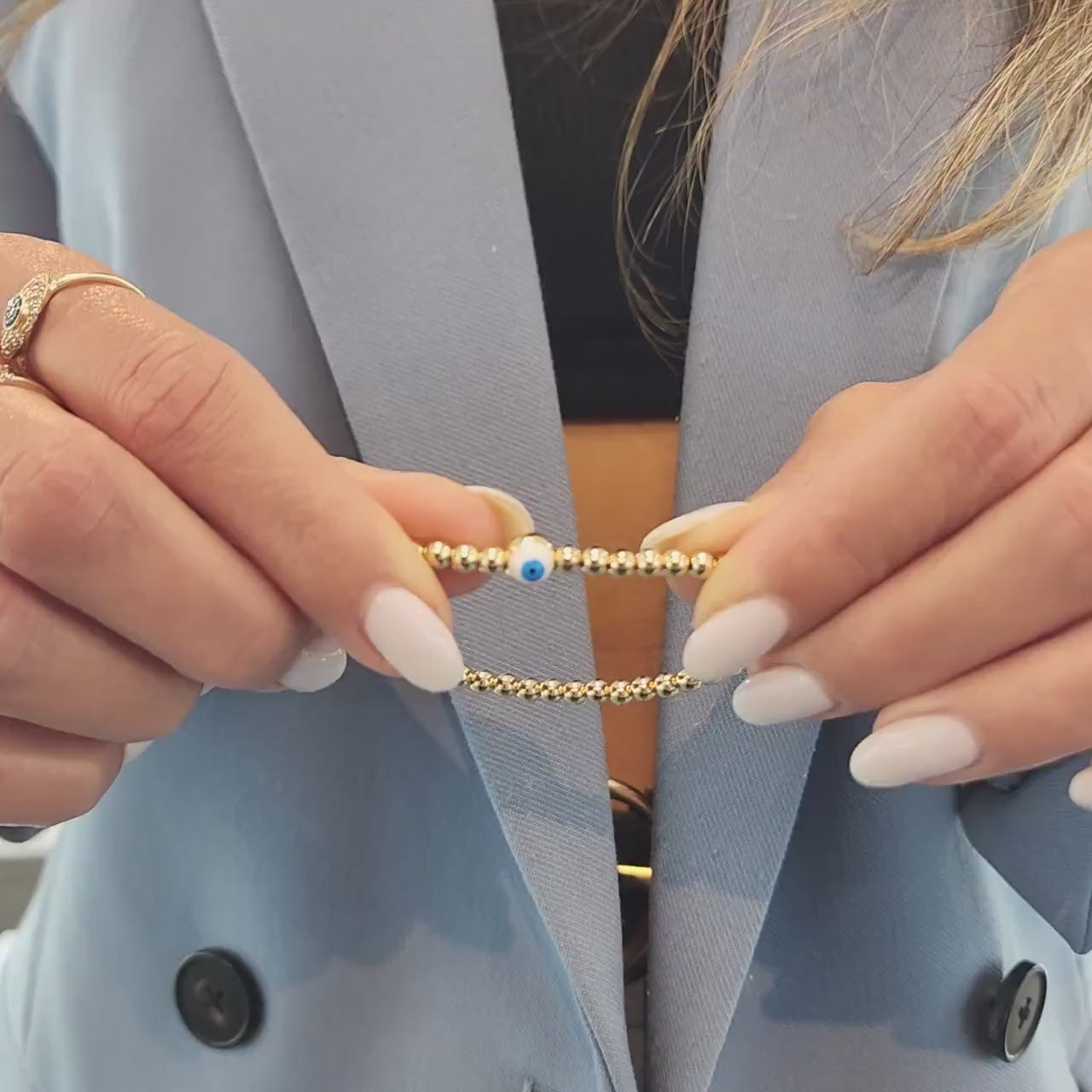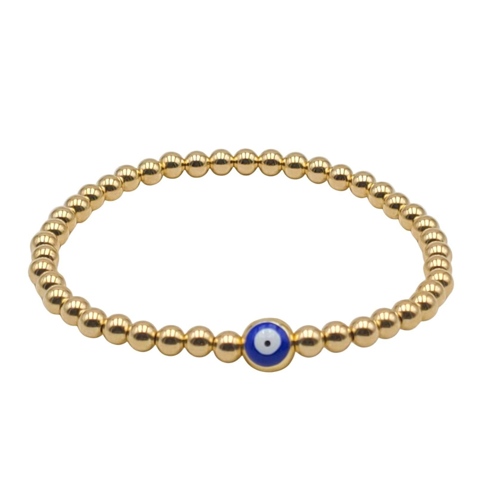 The bracelet features 4 mm gold-filled beads that exude elegance and durability, complemented by an eye-catching Evil Eye pendant in an enamel finish adorned with cubic zirconia gemstones. This combination of materials and design ensures a piece that stands out and resonates with spiritual significance. Adjustable to fit various wrist sizes, it offers comfort and versatility for all-day wear.