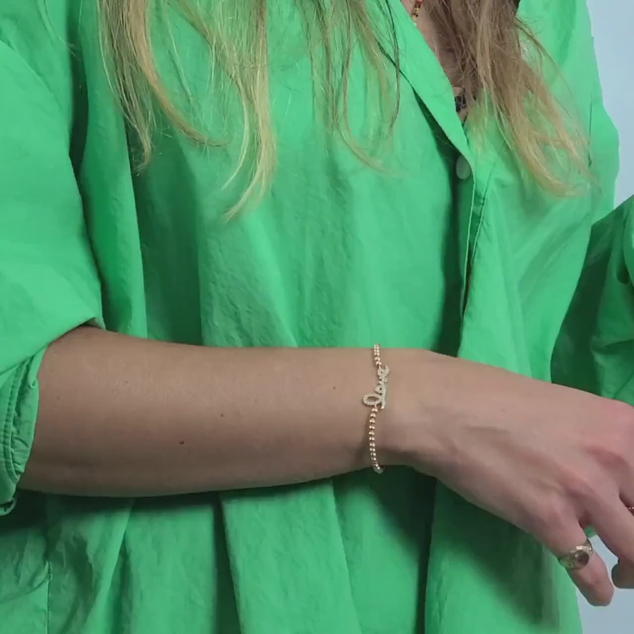 Adorned with shimmering cubic zirconia gemstones and featuring 3 mm gold-filled beads, this bracelet exudes a timeless sophistication. The 'Love' charm, crafted from gold-plated sterling silver, adds a touch of sentimentality and elegance to this dainty piece. Its adjustable design ensures a comfortable fit, available in various sizes to suit different wrist sizes and preferences.