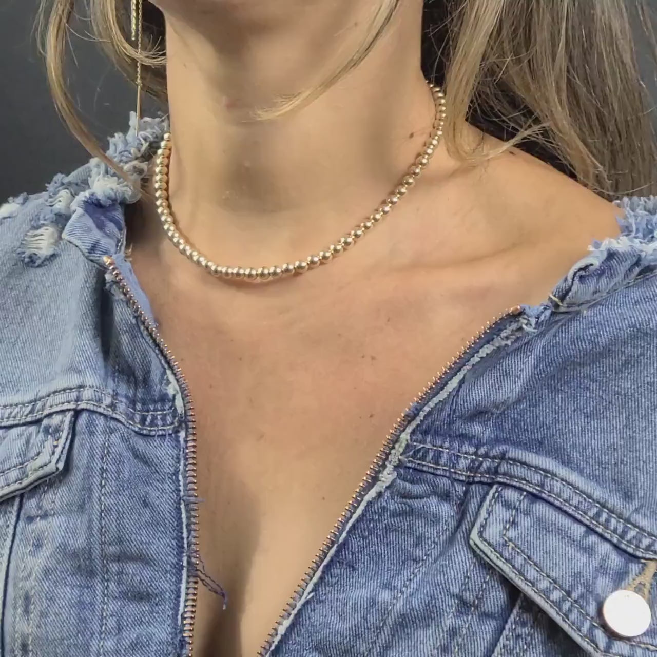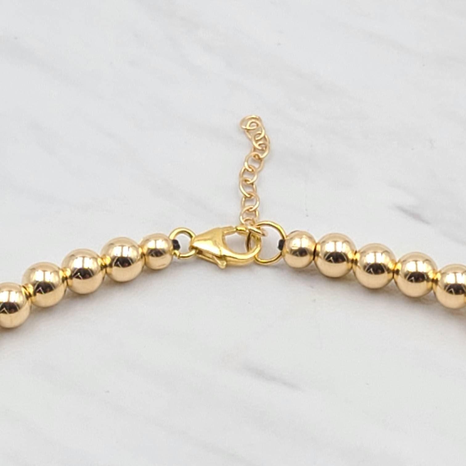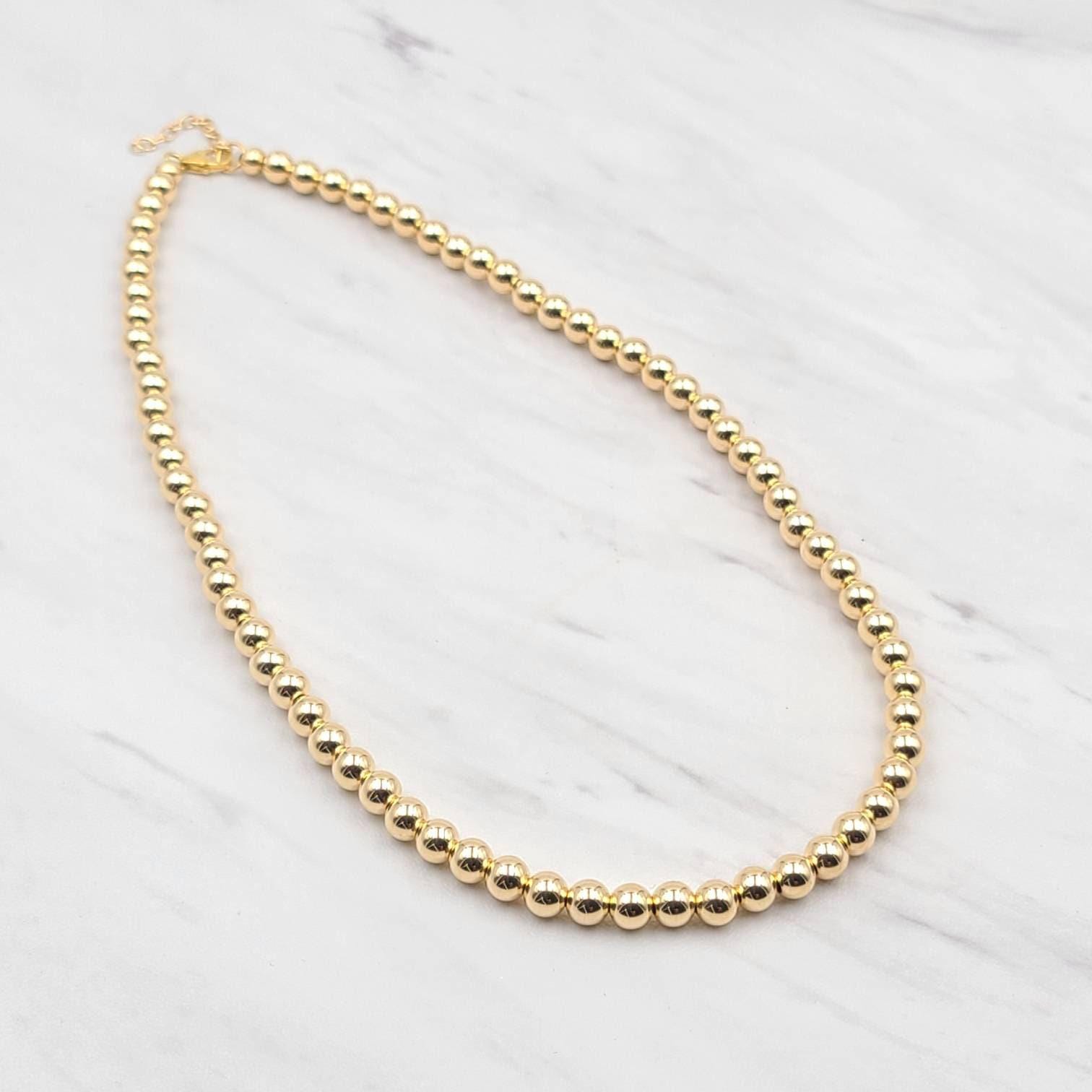 The necklace features elegant 5mm gold-filled beads, strung together to form a delicate chain that exudes charm and sophistication. The adjustable length allows for versatility, making it easy to wear with a variety of outfits. Whether you're dressing up for a special occasion or adding a touch of elegance to your everyday look, this necklace is the perfect accessory.