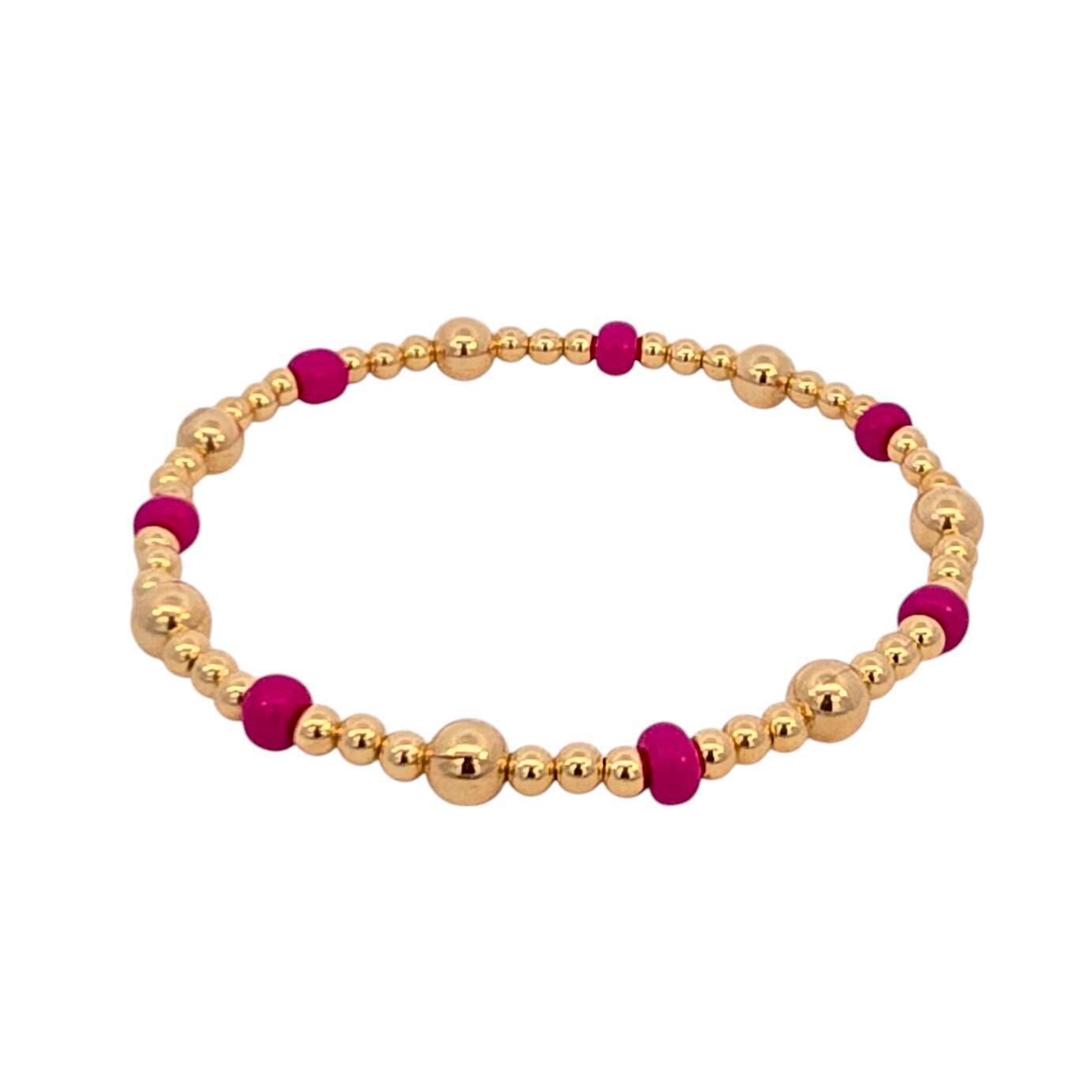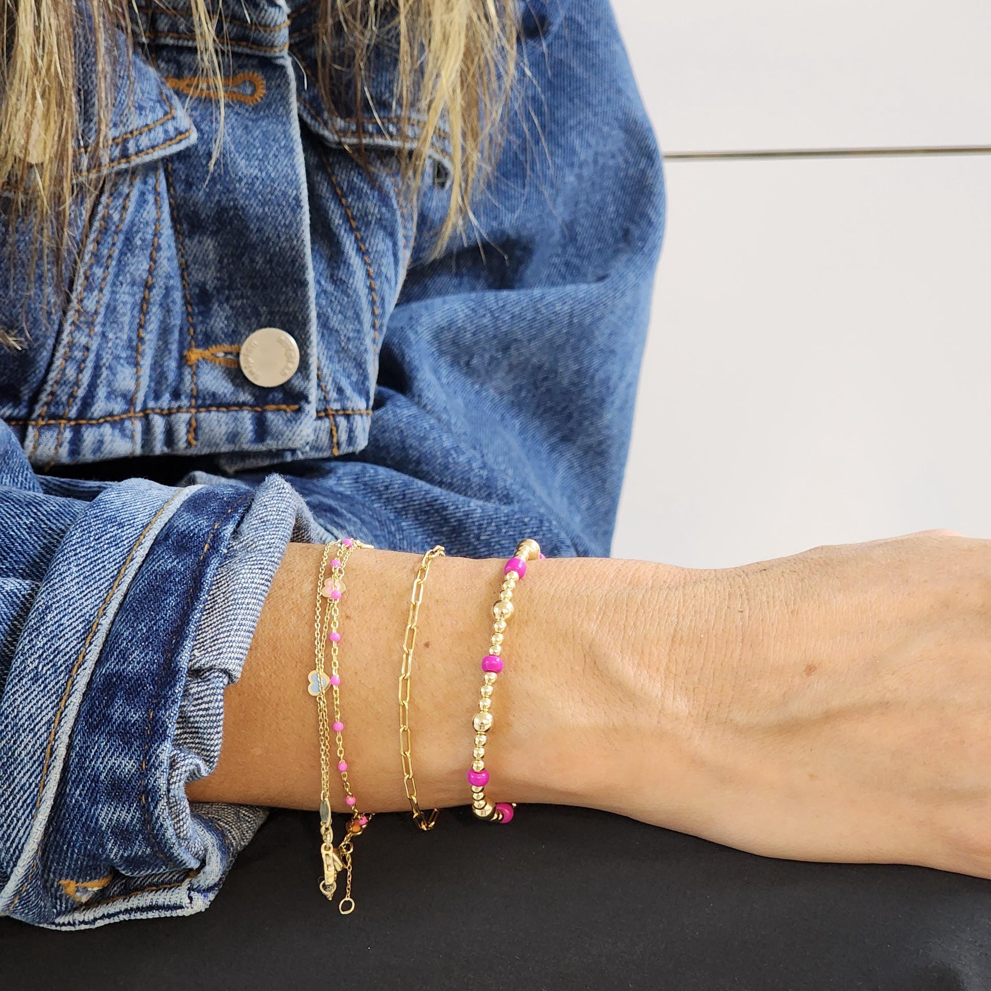 Handmade with meticulous attention to detail, this bracelet is adjustable to ensure a comfortable fit. The 3 mm and 5 mm round gold-filled beads add a touch of luxury, while the colorful beads bring a timeless elegance. Available in various sizes, including options for children, this bracelet is perfect for stacking or wearing alone. You can also opt for a sterling silver version to match your personal style.