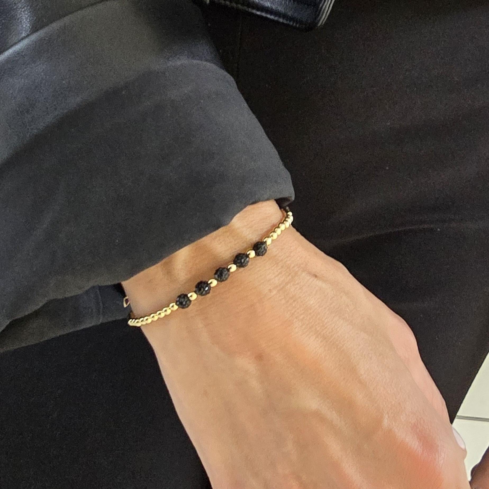 Crafted from high-quality gold filled materials, this bracelet features 3 mm beads that offer a lustrous shine and durability. The centerpiece is adorned with a round cubic zirconia-covered pendant, available in three captivating colors: black, gray, and clear. This adjustable stretch bracelet not only complements any outfit with its boho and hippie vibe but also ensures a secure fit for every wrist size.