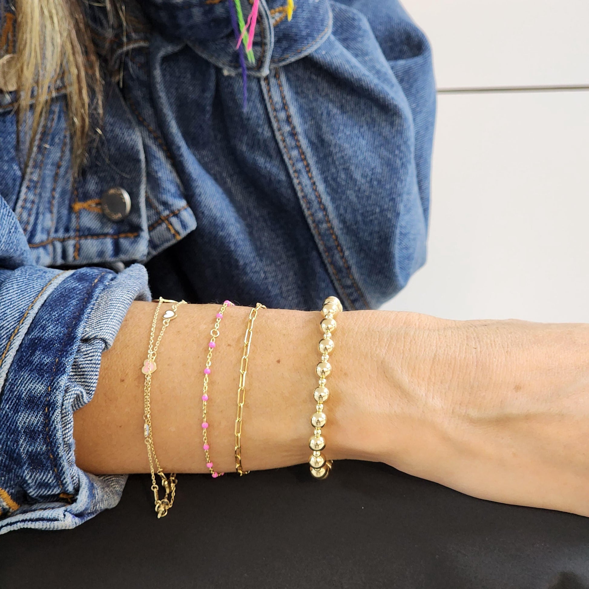 Crafted from 3 mm and 6 mm round gold-filled beads arranged in an alternating pattern, this bracelet exudes a subtle yet distinct charm. The adjustable design allows for a customized fit, making it suitable for wearers of all ages and sizes. Additionally, we offer this design in sterling silver for those who prefer a different aesthetic.