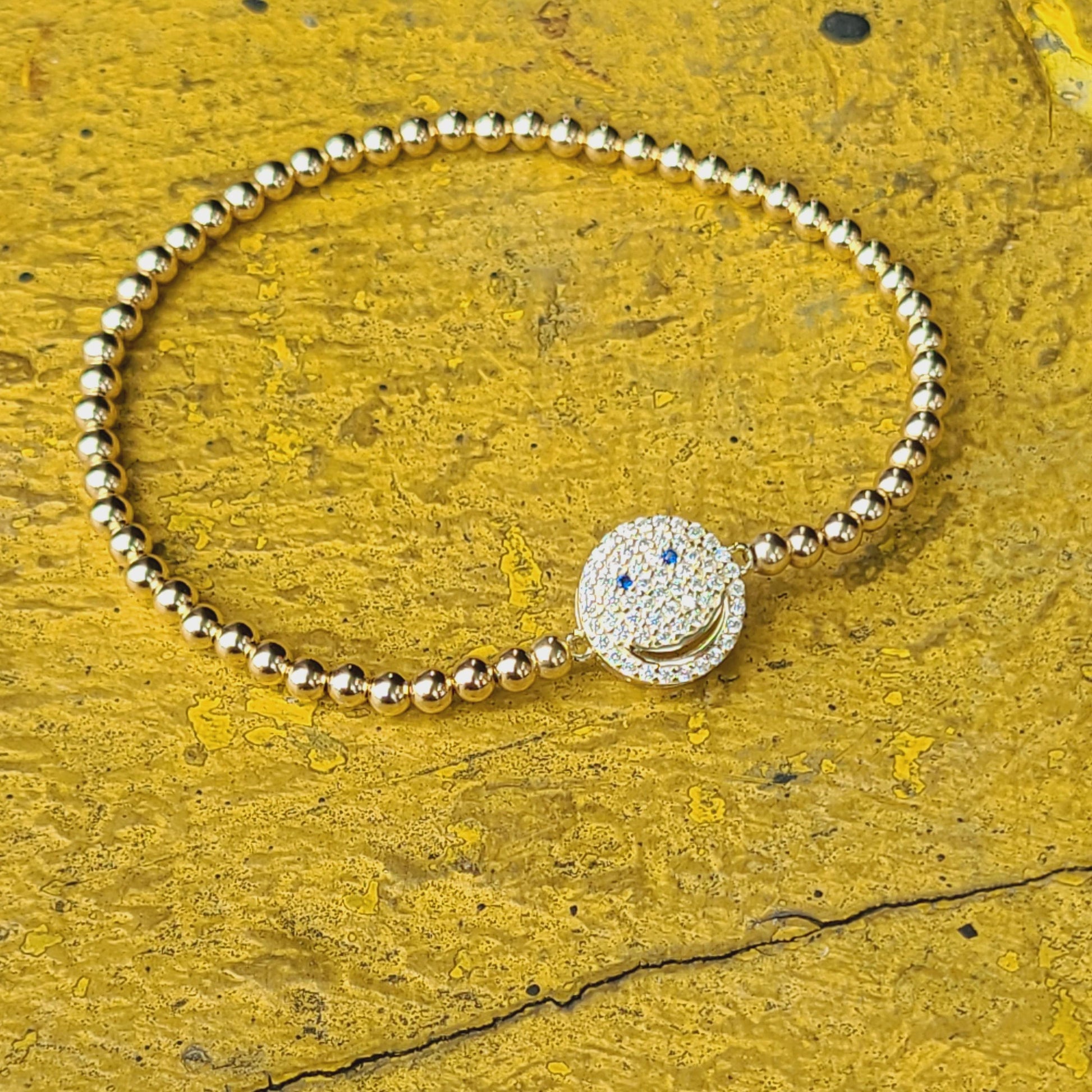 Crafted from high-quality silver and adorned with sparkling cubic zirconia gemstones, this bracelet exudes elegance with a touch of playfulness. The 3 mm gold-filled beads add a subtle shimmer, complementing the sterling silver smiley face charm beautifully. Whether worn alone as a statement piece or stacked with other favorites, this bracelet is versatile and chic, perfect for any occasion.
