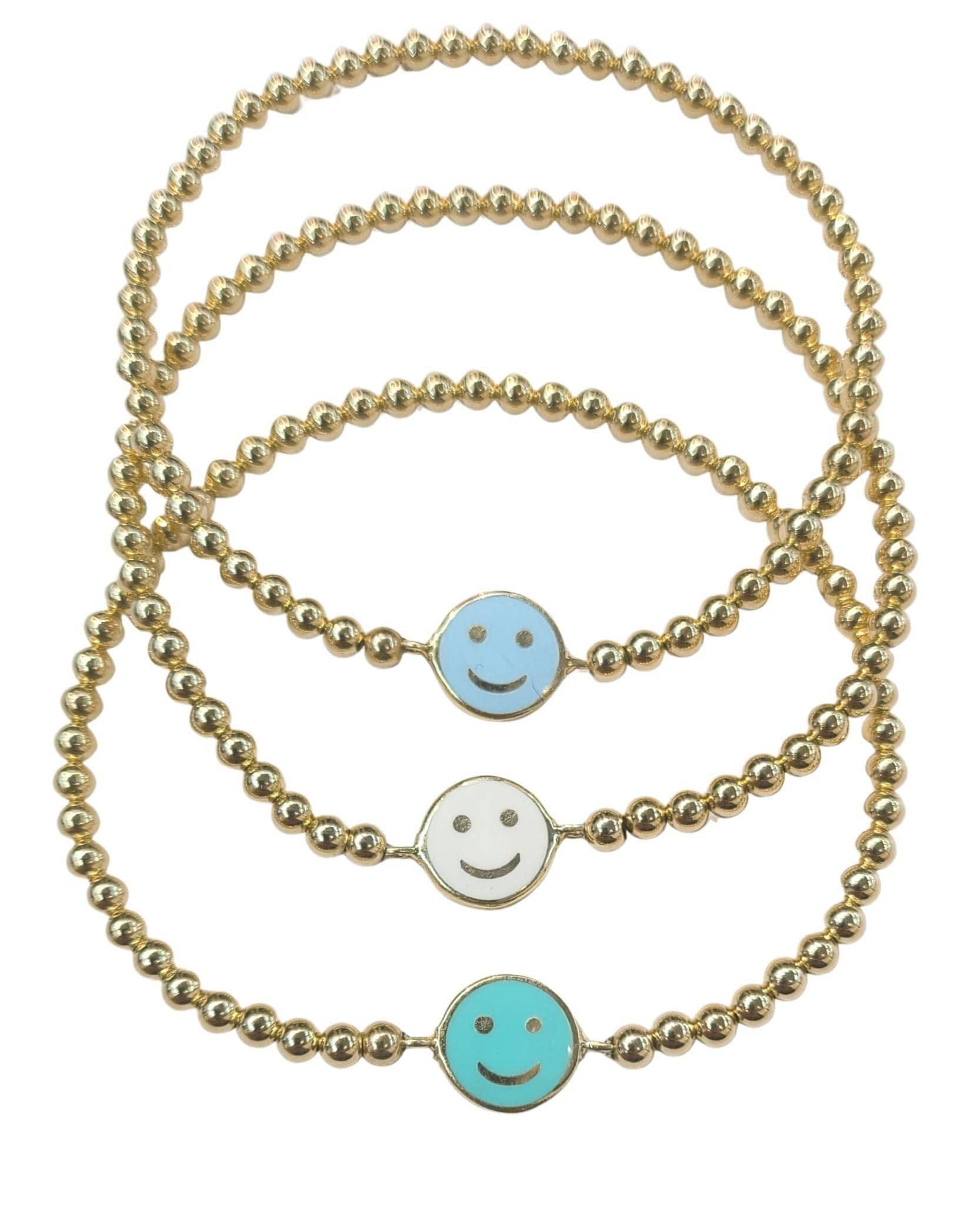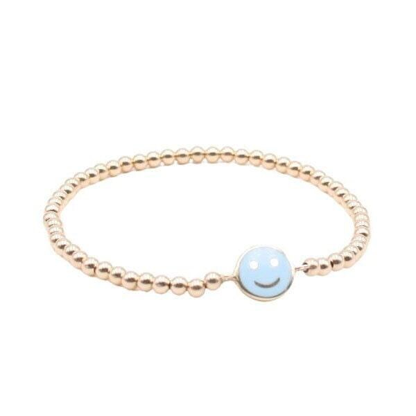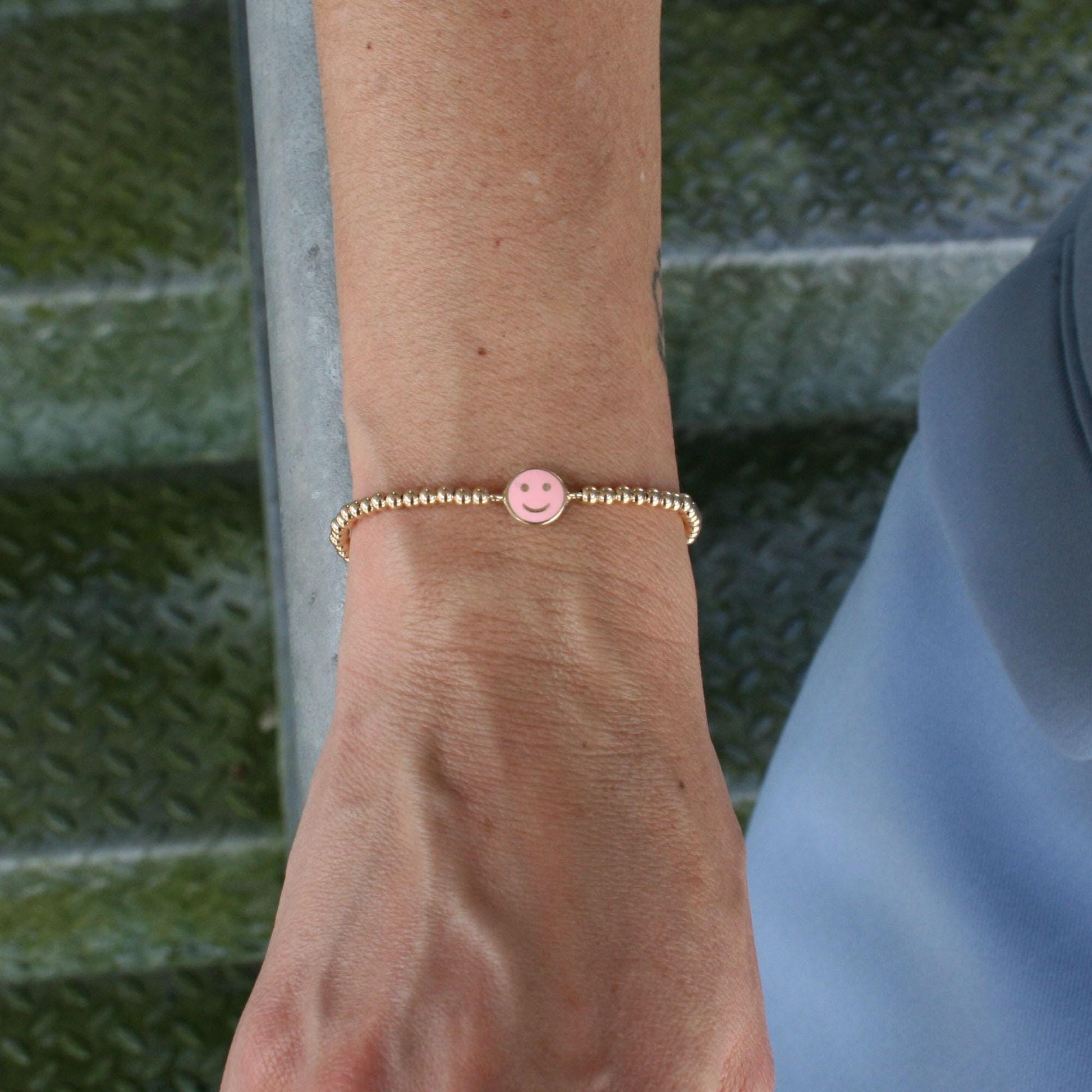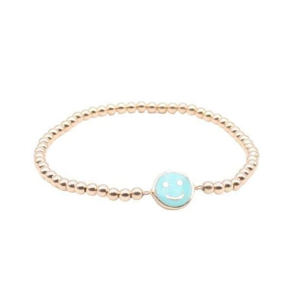 Crafted from durable gold-filled beads that are resistant to tarnishing, this bracelet is designed to withstand daily wear, including exposure to water and showers. The highlight of the piece is the Smiley Face charm, made from sterling silver with a vibrant enamel finish available in Green, Pink, Turquoise, and White. Choose your favorite color to match your mood or outfit effortlessly.