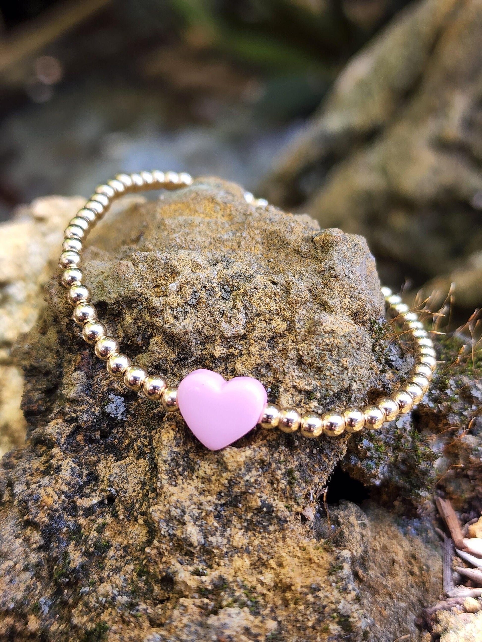 The bracelet features 3 mm gold-filled beads that exude a lustrous shine and durability, perfect for daily wear or special occasions. The enamel heart pendant, available in several vibrant colors, adds a pop of color and sentimentality to the design. Its adjustable nature allows for a comfortable fit, with sizes ranging from 6.5 inches for adults to 5.5 inches for children, ensuring everyone can enjoy this heartfelt accessory.