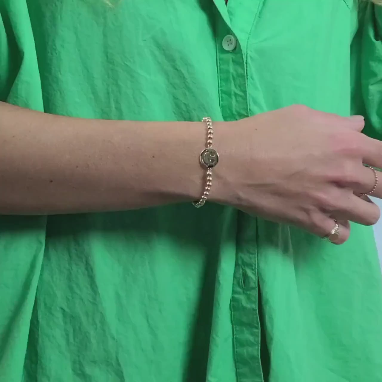 Crafted from 4 mm gold-filled beads, this bracelet offers a luxurious feel and long-lasting shine. The smiley face charm is made from gold-plated sterling silver, adding a touch of elegance to this cheerful piece. With its adjustable design, this bracelet fits comfortably on any wrist size, making it perfect for layering or wearing alone.