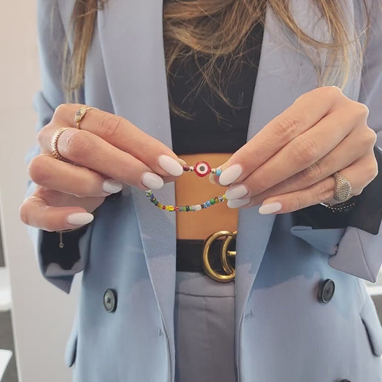 Discover the charm and protection of our Evil Eye Seed Beads Good Luck Bracelet, a vibrant addition to your jewelry collection that combines style with symbolism. Handcrafted in our Miami workshop, each bracelet is meticulously made to order using high-quality materials sourced primarily from the USA. This adjustable stretch bracelet features a captivating Evil Eye pendant surrounded by multicolored 4 mm seed beads and 3 mm gold-filled beads, offering both durability and a luxurious shine.