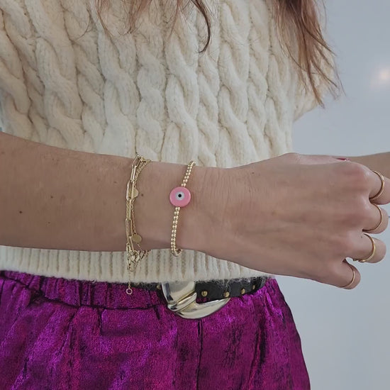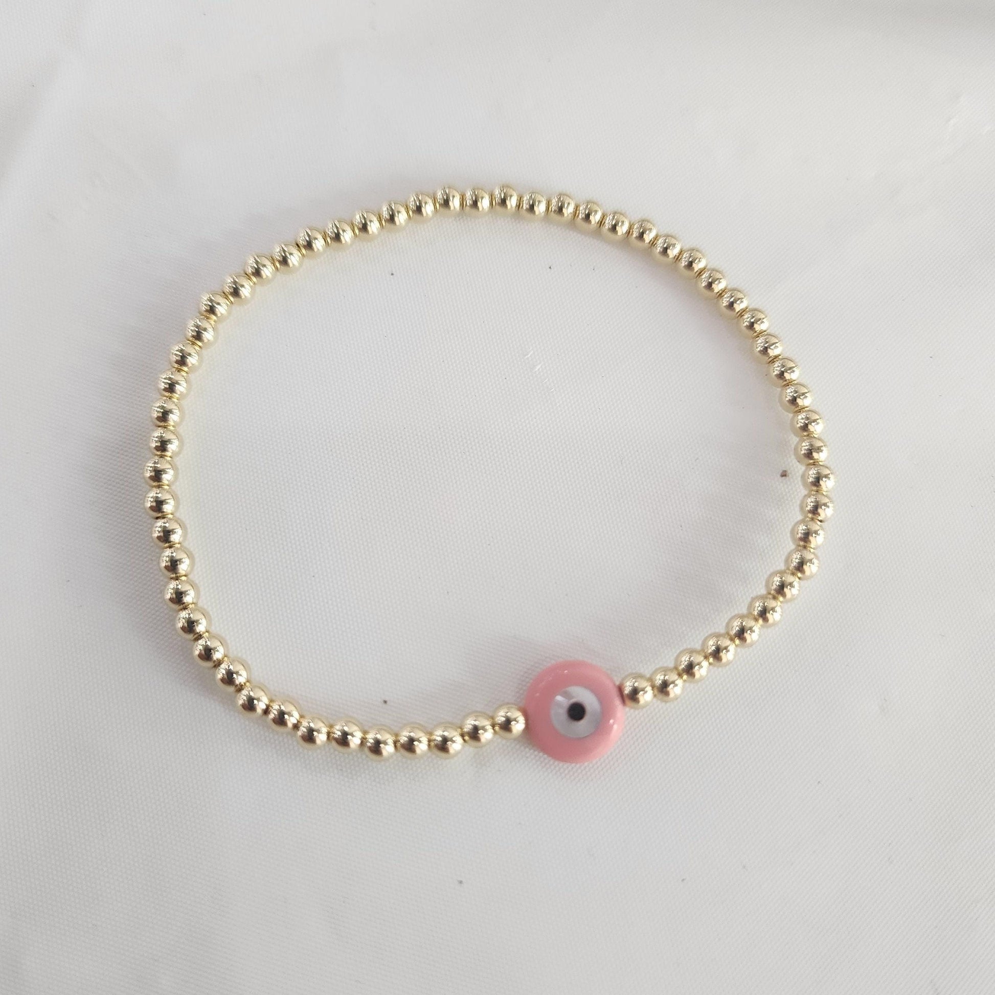 Discover the allure of spiritual protection with our Evil Eye Gold Filled Good Luck Bracelet, crafted to infuse Boho and Hippie styles with a touch of spiritual grace. This delicate piece features 3 mm beads made from high-quality gold filled materials, ensuring durability and a radiant shine that catches the eye. Adorning the bracelet is a charming pink evil eye pendant, symbolizing luck and warding off negative energy, making it a perfect addition to your daily ensemble or a thoughtful gift for a loved one.