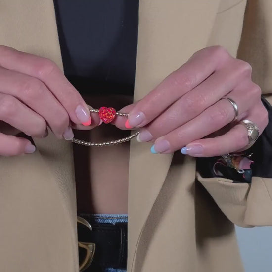 Discover elegance with our Opal Gold Filled Stacking Bracelet, a charming addition to your jewelry collection. Handcrafted with care in our Miami workshop, this bracelet combines timeless beauty with contemporary style, perfect for everyday wear or special occasions. The delicate design features 3 mm gold-filled beads that exude sophistication and durability, complemented by a heart-shaped opal in stunning shades of red, pink, and white, each meticulously gold-plated for added allure.